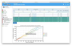 - Vergleich der Wirtschaftlichkeit aller Milchkühe am Betrieb unter Berücksichtigung von Erlösen aus Milch, Fleisch und Kälbern sowie Kosten aufgrund von Fütterung, Haltung, Fruchtbarkeit, Krankheiten und deren Folgen.