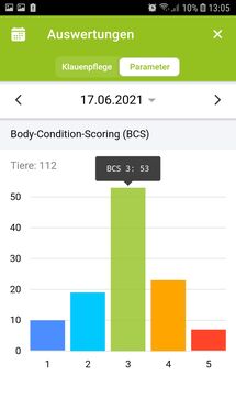 Zusätzlich zur Klauenpflege können sie unter dem Menüpunkt weitere Erfassungen wahlweise die Tiergesundheitsparameter Körperkondition (Body Condition Score - BCS), Lahmheiten (Locomotion Scoring nach Sprecher et al. 1977) und den Zwischenklauenwinkel (Klauen-Positions-Score) beurteilen und erfassen. Das Nachschlagwerk Weitere Parameter beschreibt die 3 Parameter anhand von Bild- und Videomaterial. Wie die Klauenbefunde finden sie auch diese Parameter in einem Protokoll und unter dem Punkt Auswertungen übersichtlich aufbereitet.