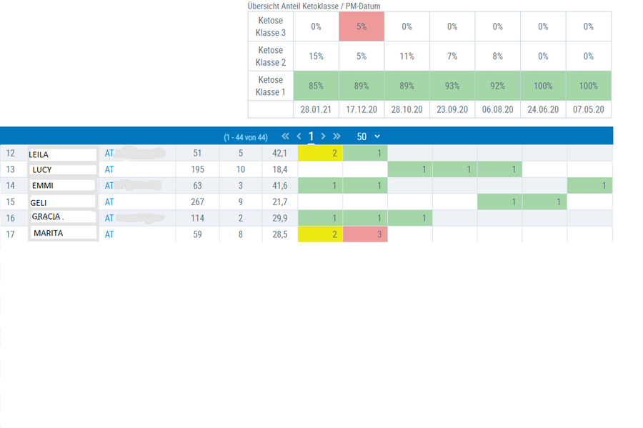 LKV-Mitgliedern steht zur Früherkennung einer Ketose die Anwendung KetoMIR im LKV-Herdenmanager kostenlos zur Verfügung. Auffälligkeiten werden mittels Ampelsystem aufgezeigt. So ist es dem Landwirt möglich, frühzeitig zu handeln und Managemententscheidungen zu treffen. Der Einstieg in den LKV-Herdenmanager erfolgt mit der LFBIS-Nr. und dem eAMA-Pin. In der RDV-Mobil App ist der Ketose-Hinweis im Bereich „Auffällige Tiere“ zu finden. Alle Tiere der Ketoseklasse 2 und 3 werden hier abgebildet.