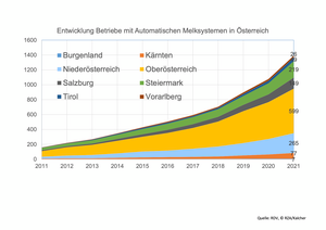 Der Trend zur Umstellung auf Automatische Melksysteme (AMS) in der heimischen Milchproduktion hält auch im Jahr 2021 an bzw. hat sich noch weiter verstärkt. Wurden im Jahr 2020 noch 181 neue Anlagen installiert damit ein Plus von 20%, so entschieden sich 2021 313 Betriebe für ein AMS. Damit erreichte der Bestand an AMS in Österreich ein Plus von 29% bzw. einen gesamten Bestand von 1.391 Anlagen mit 31. Dezember 2021. Die meisten Anlagen stehen derzeit mit 599 Stk. auf den oberösterreichischen Betrieben und damit fast die Hälfte (43%) aller Anlagen. Es folgen die Bundesländer Niederösterreich mit 265 Anlagen bzw. einem Anteil von 19% sowie die Steiermark mit 219 Anlagen (16%). Die meisten Neuinstallationen gab es in den Bundesländern Oberösterreich (+103; +21%), Steiermark (+70; +47%) und in Niederösterreich (+58; +58%) statt.