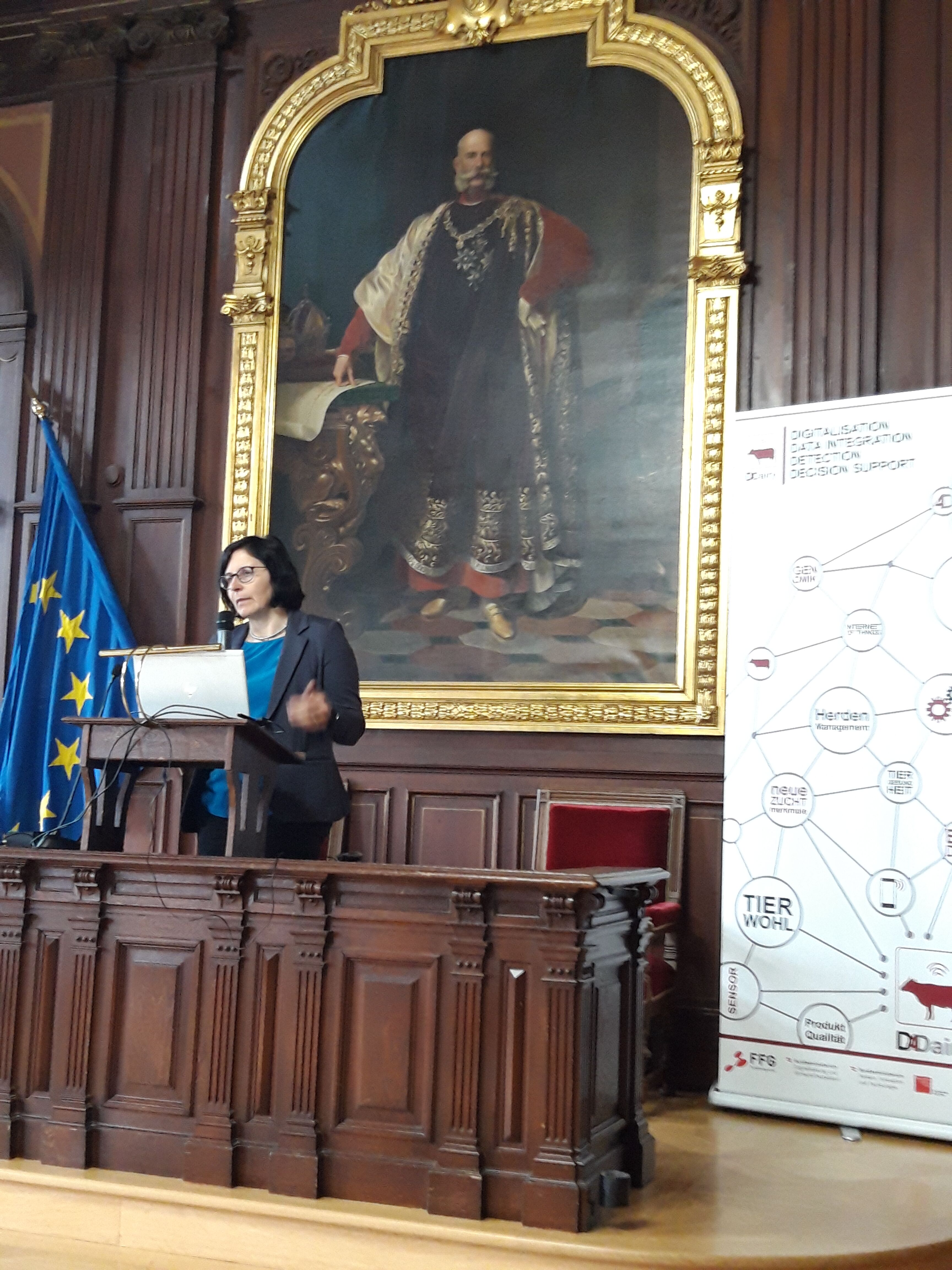 Konsortialleiterin Dr. Christa Egger-Danner, ZuchtData EDV-Dienstleistungen GmbH, freute sich, zahlreiche Vertreter:innen der am Projekt teilnehmenden Wirtschafts- und Wissenschaftspartner aus Anlass des Projektabschlusses begrüßen zu dürfen. Im Rahmen von Keynote Vorträgen und anschließenden Kurzpräsentationen wurden die Ergebnisse der jeweiligen interdisziplinär bearbeiteten Projektfachgebiete (Grundlagen für die Datenintegration, neue Ansätze zur Vorhersage und Erkennung von Krankheiten, Fütterung und Umwelt, Verbesserung der Tiergesundheit) präsentiert. Als Vortragende konnten höchst anerkannte Expert:innen aus dem für D4Dairy geknüpftem international wettbewerbsfähigen Netzwerk, bestehend aus in- und ausländischen Universitäten, Kompetenzzentren, Forschungseinrichtungen und Unternehmen entlang der Wertschöpfungskette Milch, sowie nationale und internationale Technologieanbieter:innen, gewonnen werden. Das Treffen bot den Teilnehmer:innen somit auch die Gelegenheit, sich mit Vertretern vieler verschiedener für den Milchviehbereich relevanter Organisationen auszutauschen.
