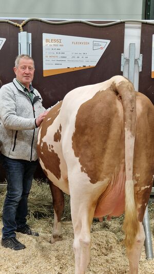 Pfleger: „Fleckvieh wird in Österreich mit modernen Zuchtmethoden und einer mit einer konsequenten Umsetzung des Zuchtprogrammes gezüchtet. Daher wurde die zweite Fleckviehgruppe mit 2 Kühen besetzt, die im Zuchtprogramm Fleckvieh Austria eine Rolle spielen und gleichzeitig von aktuellen Vätern, die aus diesem Zuchtprogramm hervorgegangen sind, abstammen. Mit der Ausstellung der GS HERZTAKT Tochter MELISSA vom Zuchtbetrieb Ernst aus Wiesmath (NÖ Genetik) bereicherte eine aktuelle Gruppensiegerin der Bundesfleckviehschau in Freistadt die Fleckviehkollektion. Ihr Vater GS HERZTAKT ist die aktuelle Nummer 3 der töchtergeprüften Vererber und festigt seinen Ruf als bester Herzschlag-Sohn. Neben ihr komplettierte die junge GS DEFACTO Tochter BLESSI die Präsentation des Zuchtprogramms. Sie stammt aus dem Zuchtbetrieb Sturmlehner aus Steinakirchen (NÖ Genetik) und wusste als Jungkuh mit über 30 kg Milch mit Rahmen, Körper und Eutersitz zu gefallen. GS DEFACTO könnte mit der Vererbungstendenz seiner ersten Töchter in die Fußstapfen seines berühmten Vaters GS DER BESTE treten.“ Zusammengefasst sieht Reinhard Pfleger die Rasse Fleckvieh als die beste Doppelnutzungsrasse der Welt, einsetzbar von „Eis bis Heiß“ auf allen Kontinenten der Welt und streicht dadurch deren Anpassungsfähigkeit hervor.
