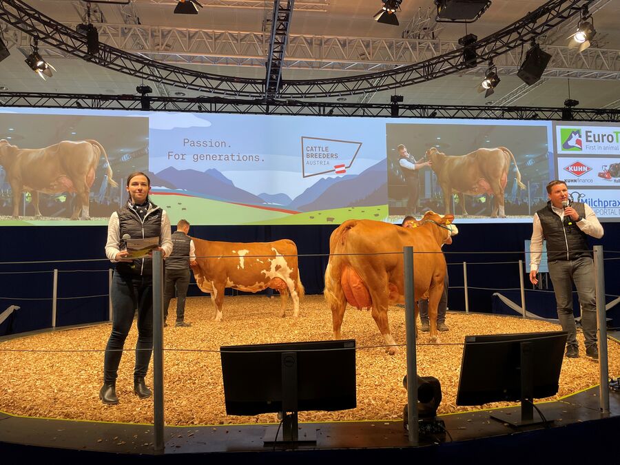 Die RINDERZUCHT AUSTRIA zeigte heimische Spitzengenetik aus der österreichischen Rassenvielfalt. Mit der Begrüßung „Servus aus Österreich“ startete Moderatorin Stefanie Zottl mit Fleckvieh Austria GF Reinhard Pfleger die Präsentation am Top-Tier-Treff. Die Rasse Fleckvieh wurde mit zwei Töchtern des aktuellen Spitzenvererbers GS DER BESTE repräsentiert. „GS DER BESTE ist ein wahrer Ausnahmevererber der Rasse, der mit Leistungsfähigkeit und Steigerung der Leistung von Laktation zu Laktation punkten kann. Von ihm gibt es bereits 1.100 linear beschriebene Töchter. Der Euterzuchtwert liegt bei starken 133 Punkten, was ihn zu einem begehrten Vererber mit hoher internationaler Nachfrage macht,“ so Pfleger. GLOCKE aus dem Betrieb Ehrenhöfer aus St. Lorenzen/Wechsel (RSTM) und KIMBERLY vom Zuchtbetrieb Bauer aus Ratten (RSTM) zeigten eindrucksvoll die Stärken von GS DER BESTE bei Leistungsbereitschaft und Euterqualität. „Fleckvieh ermöglicht eine effiziente Produktion von Milch und Fleisch mit gesunden und fruchtbaren Kühen und bestens mastfähigen männlichen Tieren. Fleckvieh ist die Rasse der Zukunft in Ökonomie und Ökologie“ so Pfleger in seinem Statement.