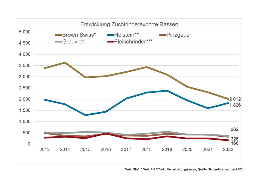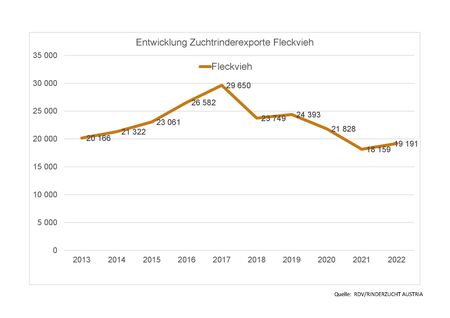 Im Jahr 2022 wurden 23.919 Zuchtrinder exportiert, um 717 Stk. oder 3,1 % mehr als im Vorjahr. Davon wurden 55 % innerhalb der Europäischen Union vermarktet, die restlichen 45 % nach Drittländern. Italien ist jenes Land mit den meisten importierten österreichischen Zuchttieren. Das Land ist schon seit jeher ein wichtiger Handelspartner der heimischen Rinderwirtschaft und Rinderzucht. Allein 6.000 Stk., das sind ein Viertel aller Tiere, wurden über kürzeste Transportwege dorthin geliefert.