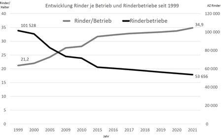 In Österreich gibt es ein klares Ost-West -Gefälle in Bezug auf die Betriebsgrößen. Werden im Burgenland im Schnitt 51 Rinder gehalten, so stehen auf den Tiroler Betrieben im Schnitt 23 Tiere. In Österreich hält jeder Rinderbauer durchschnittlich 35 Rinder bzw. 20 Milchkühe. Im internationalen Umfeld ist die heimische Tierhaltung sehr klein strukturiert, zum Vergleich: in unserem Nachbarland Deutschland werden 96 Rinder je Betrieb gehalten, in Tschechien 118 bzw. in Belgien und Großbritannien jeweils 116. In Summe gibt es in Österreich 1 861 071 Rinder auf 52 540 Betrieben. Noch, denn seit dem Jahr 2010 ist die Anzahl der Betriebe um 18.000 zurückgegangen. D.h., dass im Schnitt der letzten 11 Jahre alle fünf Stunden bei einem Rinderbetrieb für immer die Stalltüre geschlossen bleibt! Die bestehenden Betriebe wachsen und kompensieren teilweise den Rückgang des Rinderbestandes. Die Gründe für die Schließungen sind vielfältig. Einerseits erhöhen niedrige Erzeugerpreise den Wachstumsdruck, vielen kleineren Betrieben fehlt jedoch das Kapital für Investitionen. In der Regel werden die Betriebe von einer Generation an die nächste weitergegeben. Oftmals fehlt dann auch die entsprechende Nachfolge, weil der Jugend auch teilweise die Perspektive auf derartigen Betrieben fehlt und einem anderen Job nachgehen.