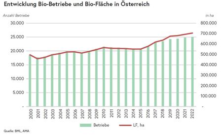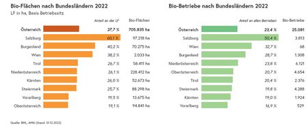 Nach Bundesländern gab es die größten Zuwächse bei den Bio‐Betrieben in Wien mit 8 %. In den anderen Bundesländern lag der Zuwachs zwischen 1‐2 %. Den höchsten Anteil von Bio‐Betrieben weist Salzburg mit 50 % auf, gefolgt von Wien mit 33 % und dem Burgenland mit knapp unter 29 %. 2022 wurden in Österreich mit einem Anteil von 27,7 % mehr als ein Viertel der landwirtschaftlich genutzten Fläche (LF) biologisch bewirtschaftet, in Summe sind das rund 705.800 ha LF. Im Vergleich zu 2021 entspricht das einem Flächenzuwachs von rund 11.400 ha bzw. 1,6 %, wovon 7.700 ha auf das Ackerland, 2.500 ha auf das Dauergrünland und die restlichen Flächen auf Weingärten (+ 1.050 ha) und Obstanlagen (+ 130 ha) entfielen.