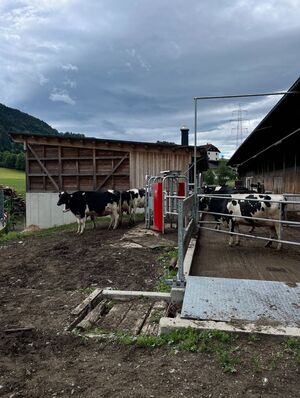 Weiter ging es in den Stall, den Wolfgang überhat und der für 60 Milchkühe Platz bietet und biologisch bewirtschaftet wird. Angrenzend befindet sich der Auslauf, den die Tiere sehr gerne benutzen. Hauptrasse am Hof ist Holstein, aber vereinzelt haben sich mittlerweile auch Jerseys hineingeschlichen. Der Stall wurde 2009 erbaut und es wurden in der Planung schon die Vermarktungsräume mitgemacht. Vor rund 2 Jahren wurde vom Melkstand auf einen Roboter der Firma Lely umgestellt, mit sehr positiven Rückmeldungen. Ein Teil des Melkstandes wurde zum Kälberstall umfunktioniert. Neben der Investition in den Roboter, wird auch ein Weidetor eingesetzt und gewährt den Tieren den Ausgang auf die Weide. „Vermehrt gehen die Milchkühe lieber nachts hinaus als tagsüber.“, so Wolfgang Schwenner. Durch den Umstieg auf den Melkroboter, stieg auch die Leistung an, da der Roboter der Kuh das nötige gibt, was sie braucht. Allzu große Zukunftspläne möchten Astrid und Wolfgang nicht schmieden, denn sie wollen abwarten in welche Richtung ihre drei Kinder gehen.