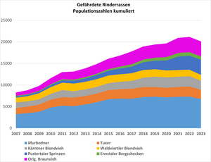 Aktuelle Maßnahme im ÖPUL-Programm zur Erhaltung gefährdeter Nutztierrassen und wie dadurch die genetische Vielfalt besser erhalten werden kann, erläuterte Dipl.Tzt. Beate Berger von der HBLFA Raumberg-Gumpenstein. So waren ursprünglich alle gefährdeten Rinderrassen in Österreich Mehrnutzungsrinder auf Arbeits-, Fleisch- und Milchleistung. Der Rückgang des Bedarfs an Arbeitsleistung Mitte des 20. Jahrhunderts trug dann zum Niedergang dieser Rassen bei. Seit dem Jahr 1982 werden in Österreich Programme für die Erhaltung dieser Rassen angeboten. Mit dem EU-Beitritt im Jahr 1995 wurde es Teil des ÖPUL-Programmes im Rahmen der Gemeinsamen Agrarpolitik. So konnten deren Populationen zumindest stabilisiert bzw. bei den Rassen Murbodner und Pustertaler Sprinzen ein kontinuierlicher Zuwachs erreicht werden. Weiters ist bei den meisten gefährdeten Rassen lt. ZuchtData Jahresbericht ein Trend weg von der Milchproduktion hin zur Fleischnutzung zu beobachten. Damit besteht die Gefahr, dass der Zweinutzungscharakter für diese Rassen verloren geht. Erhöhte Prämien für Kühe unter Milchleistungskontrolle könnten dazu beitragen, den Zweinutzungscharakter der gefährdeten Rassen auch in Zukunft zu bewahren. Eines der größten Hindernisse für eine kontinuierliche Populationsentwicklung in den früheren Programmen war der Einstiegsstopp, der im neuen Programm nun beseitigt werden konnte.
