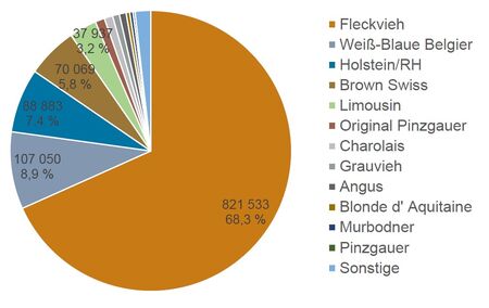 Nach Rassen wurden am meisten Portionen vom Fleckvieh abgesetzt, insgesamt 822.000 Portionen, das sind 68 % aller abgesetzten Samen, 107.000 Portionen bzw. 8,9 % von der Rasse Weiß-Blaue Belgier, von der der Rasse Holstein wurden 89.000 Portionen (7,4 %) abgesetzt sowie 70.000 (5,8 %) von Brown-Swiss-Stieren. In Bezug auf die Rassen ging der Absatz beim Fleckvieh um 3,1 % oder 27.000 Portionen zurück, bei Brown Swiss um 1,3 % sowie bei den Fleischrindern um 0,8 %. Leicht gesteigert wurde der Absatz bei den Weiß-Blauen Belgier (+1,1 %) und bei Holstein (+1,1 %).