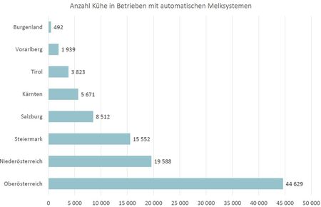 Am meisten Kühe werden in Oberösterreich gemolken, nämlich 13,8 % aller Milchkühe. Dort stehen mit 803 Stk. auch die meisten Anlagen. Den geringsten Anteil weist Tirol mit 1,4 % aus. Der Datenaustauch erfolgt über den Rinderdatenverbund RDV. Mit dem RDV stehen rund 100 Schnittstellen zur Verfügung, um den Datenaustausch zwischen den AMS-Herstellern, den Kontrollverbänden und den Landwirt:innen weitgehendst zu vereinfachen bzw. Doppelgleisigkeiten in der Dateneingabe zu vermeiden.