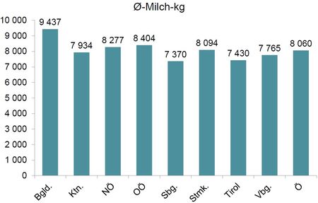 Tirol und Vorarlberg weisen weiterhin die höchste Kontrolldichte auf, mit 88,8 % bzw. 88,3 % der Milchkühe, gefolgt von Niederösterreich mit 84,2 % und der Steiermark mit 81,7 %. Die Milchleistung entwickelte sich regional sehr unterschiedlich. Über alle Rassen hinweg erzielten die Kontrollkühe durchschnittlich 8.060 kg Milch mit 4,15 % Fett und 3,42 % Eiweiß. Mit einem heurigen Plus von 142 Milch-kg je Kuh und Jahr konnte erstmals die bundesweite Durchschnittsleistung von 8.000 kg überboten werden. Die höchsten Leistungszuwächse gab es in Oberösterreich (+335 kg), in Niederösterreich (+179 kg) und in Tirol (+56 kg). Die durchschnittlichen Fettprozente sanken um 0,01 Prozentpunkte während die Eiweißgehalte leicht um 0,02 Prozentpunkte anstiegen. Die burgenländischen Betriebe erzielten mit 9.437 kg Milch erneut die höchsten Durchschnittsleistungen sowie den höchsten Fettgehalt (4,32 %), während Oberösterreich mit 3,46 % den Spitzenwert beim Eiweißgehalt erreichte.