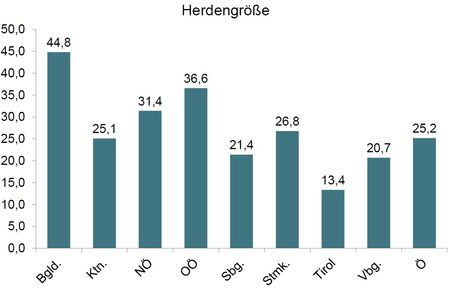 Die durchschnittliche Herdengröße stieg auch in diesem Jahr leicht an und liegt nun bei 25,2 Kühen pro Betrieb (2023: 24,7). Die größten Betriebe finden sich weiterhin im Burgenland mit durchschnittlich 45 Kühen je Betrieb, während Tirol die kleinsten Strukturen mit durchschnittlich 13 Kühen aufweist.