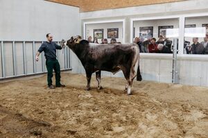 Stiervorführung in der Besamungsstation GENOSTAR in Kagelsberg mit einem Brown Swiss-Stier. -