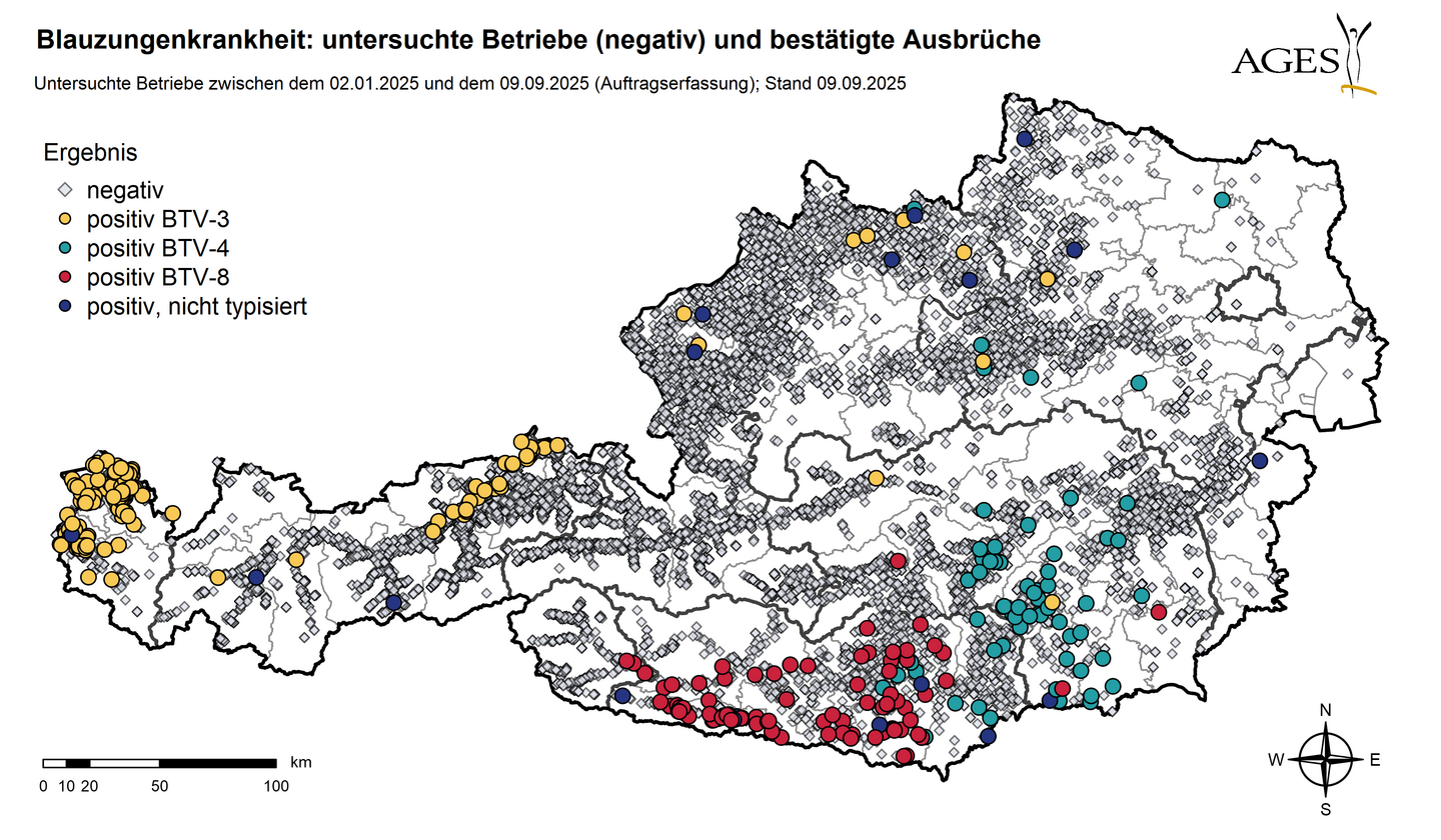 Vor allem in Kärnten kommt es derzeit zu einer starken Verbreitung des Serotyps 8, teilweise mit schweren Krankheitsverläufen und auch Verendungen bei Rindern und Schafen. Der Serotyp 8, der sich in den vergangenen Wochen von den Balkanländern über Italien nach Norden bewegt hat, wurde bereits in über 80 Rinderbetrieben in Kärnten nachgewiesen. Fachleute gehen davon aus, dass die tatsächliche Zahl betroffener Betriebe deutlich höher liegt.