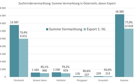 Auf den heimischen Versteigerungen bzw. Ab-Hof-Märkten wurden im 1. Halbjahr 2025 insgesamt 16.734 Zuchtrinder vermarktet, davon gingen 12.532 Tiere, das sind 76,5 %, in den Export. Der gesamte Absatz in der Vermarktung ging im 1. Halbjahr 2025 um rund ein Viertel um 5.700 Tiere zurück. Die Durchschnittspreise bei den Versteigerungen lagen bei 2.637,- und damit 157,- (6,3 %) über den Vorjahrespreisen (ohne Zuchtkälber weiblich). Die Ab-Hof-Preise hielten sich bei 1.872,- und reduzierten sich um 2,7 % bzw. um 52,-.