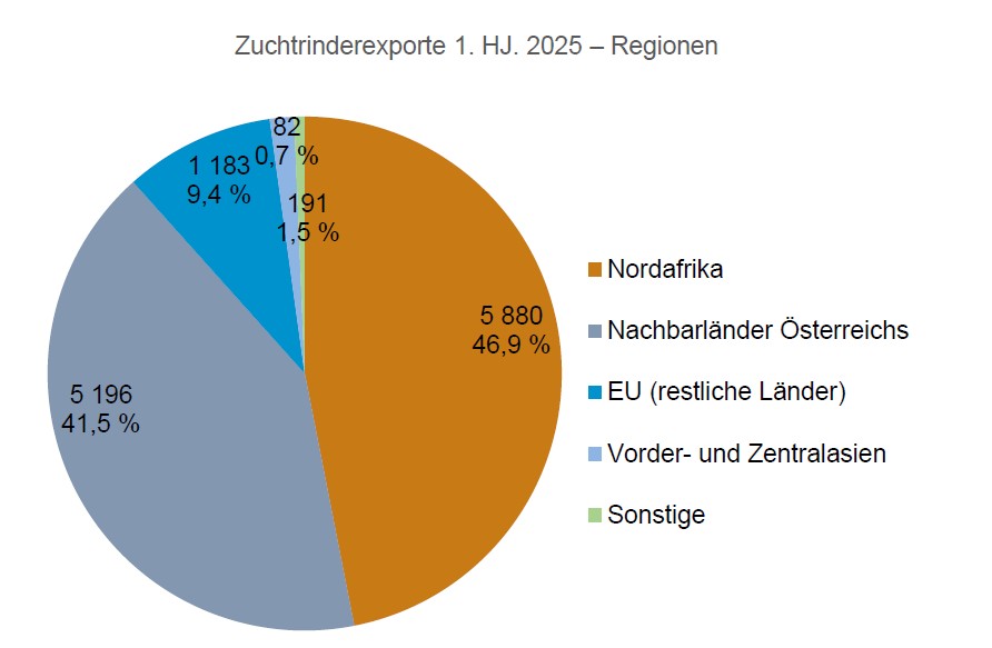 Diese kamen im letzten Quartal 2024 nahezu zum Stillstand. Im ersten Halbjahr 2025 gingen die Exporte um rund ein Viertel (25,8 %) bzw. um 4.359 Stk. zurück. In Summe wurden 12.532 Zuchtrinder exportiert.