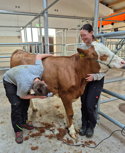 Der zweite Tag widmete sich der Fütterung und Futterbewertung. Nachdem Ing. Gregor Großpointner vormittags die fachlichen Grundlagen erarbeitete, lieferte er am Nachmittag hierfür praxisnahen Input direkt am Betrieb Neudorfer in Pilsbach. Dort führten die Teilnehmer eine sensorische Prüfung von Heu sowie Gras- und Maissilagen durch und beobachteten aufmerksam das Fressverhalten der Tiere im Stall. Am späten Nachmittag wurde es handwerklich: Unter der Anleitung von Magdalena Moser erlernten die Schüler die richtige Handhabung der Schermaschine sowie die passende Technik, um die Tiere schaugerecht vorzubereiten.